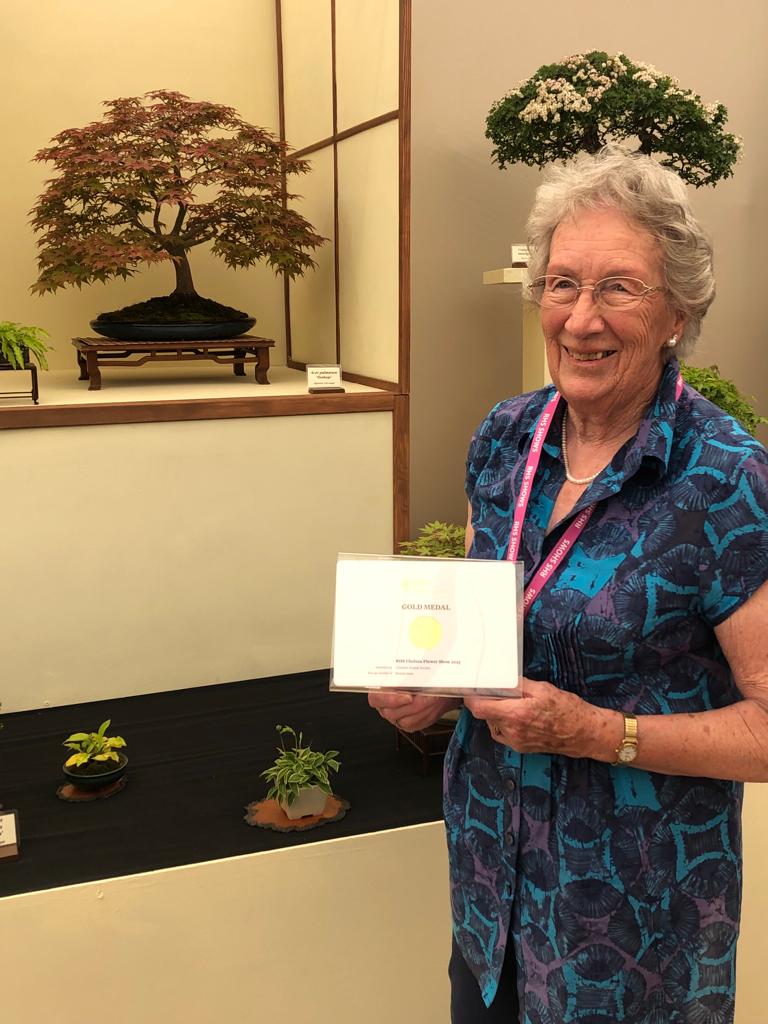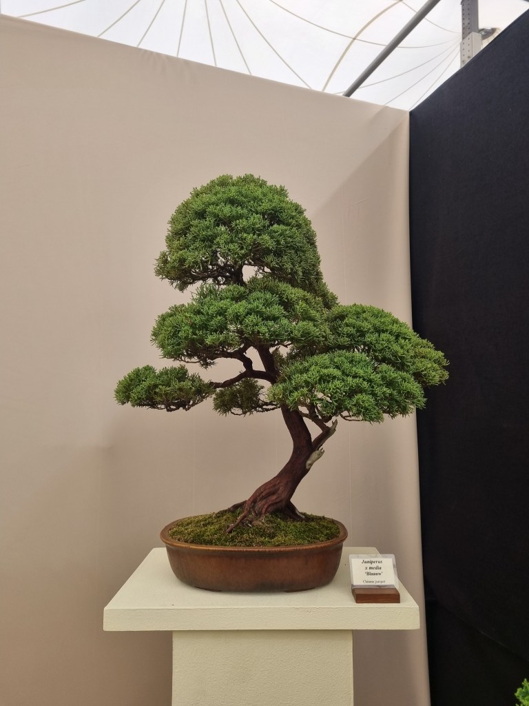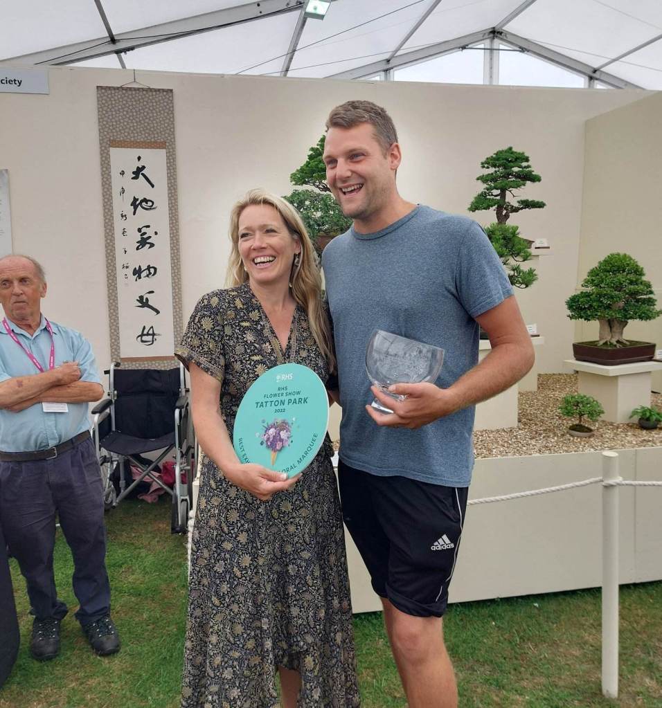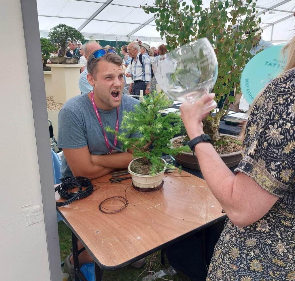 I (Matt, Membership Secretary (and Shows Coordinator)) was happily working on one of my trees, demonstrating to the public, when I was approached by someone bearing gifts! We had won the Coveted Best Exhibit in the Floral Marquee award!